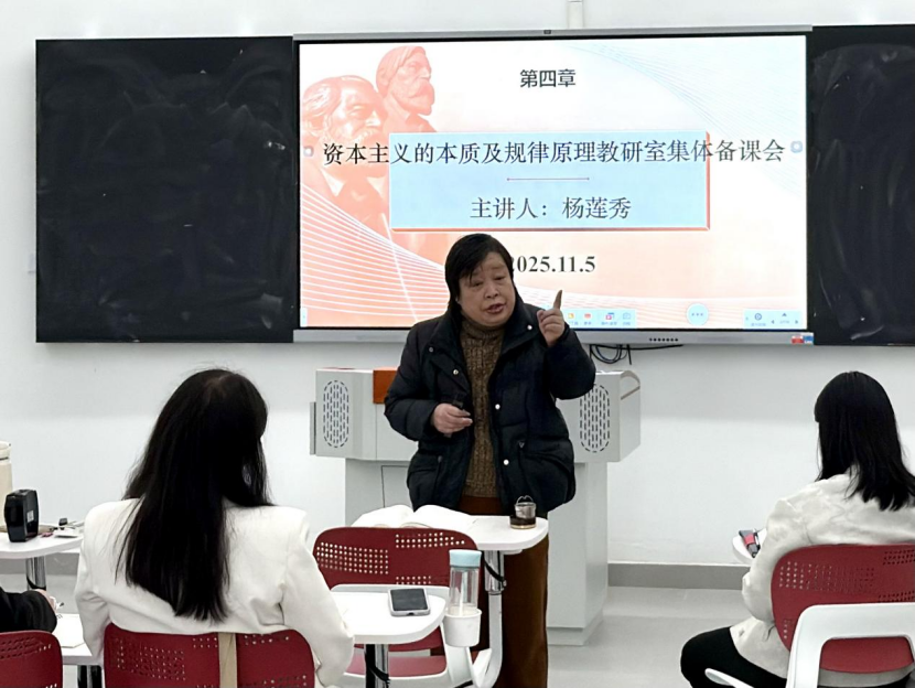 杨莲秀教授就第四章“资本主义的本质及规律”进行系统说课。她以《资本论》第一卷为主要理论依托,深入剖析资本主义生产方式的历史生成、剩余价值的本质及其运动规律,通过对经典文本的框架性梳理,构建起逻辑严密、结构完整的教学内容体系,为教研室教师提供了扎实的理论支撑和清晰的教学路径参考。